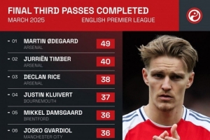 kaiyun网站-英超3月进攻三区成功传球排名:厄德高49次居首,阿森纳包揽前三